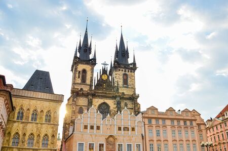 Church of Our Lady before Tyn in Prague, Czech Republic photographed in beautiful sunrise against the sun. Gothic church and a dominant feature of the Old Town Square. Amazing Czechia.