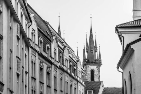 Two towers od Church of Our Lady before Tyn partly hidden behind old town buildings, Prague, Czech Republic. Black and white image.