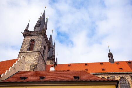 Detail of the Prague in the Old Town. Old Town square with Tyn Church. View of Prague.