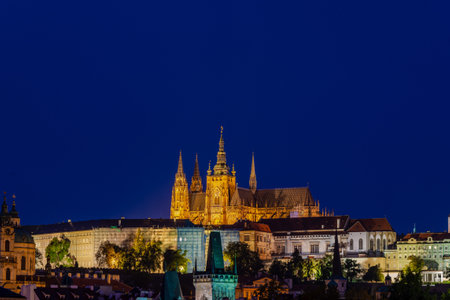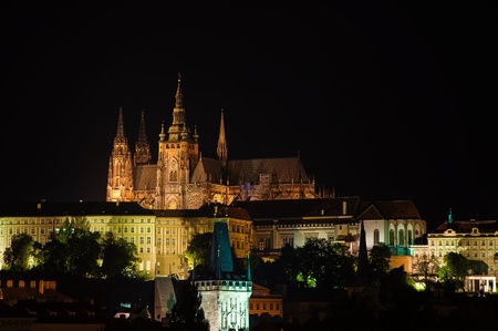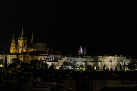 The night View on bright Prague with St. Vitus Cathedral and gothic Castle