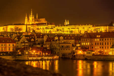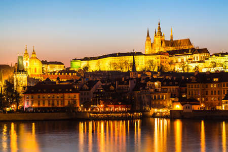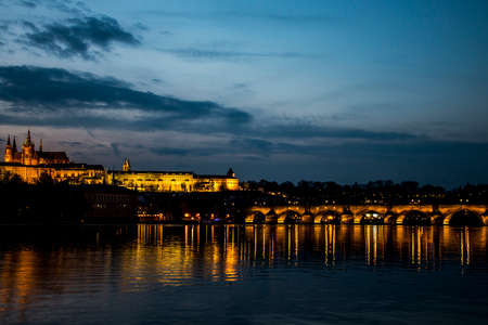 beautiful night view of old town and Prague castle with river Vltava, Czech Republic