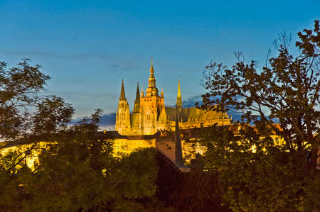 The historic center of Prague: Prague castle in the evening after sunset with the included decorative lighting