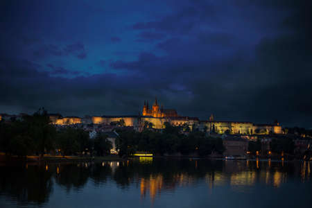 night view of Saint Vitus Cathedral in Prague from Vltava river