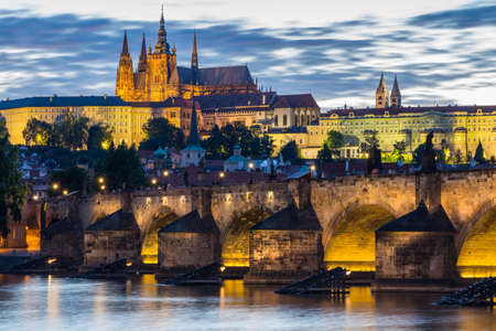 skyline of Prague with Vitus cathedral and Charles bridge at night, Czech Republic