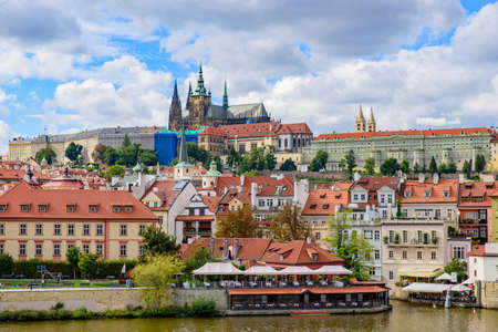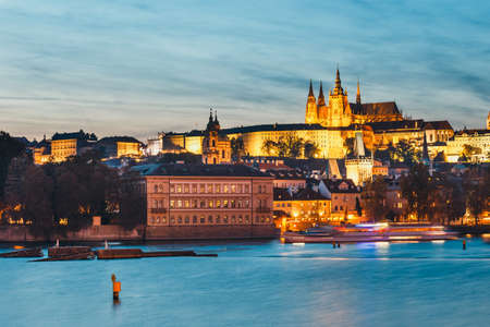 Prague, Czech Republic - October 10, 2017: Beautiful evening view on the Dvorak embankment, Saint Vitus Cathedral, Vltava river and old town of Prague. Panorama of Prague city center, Czech Republic.