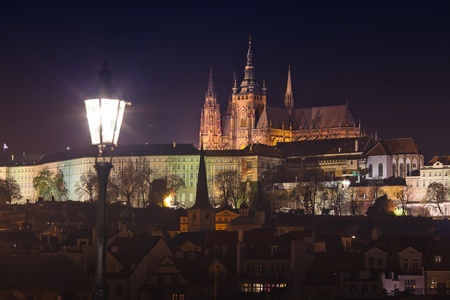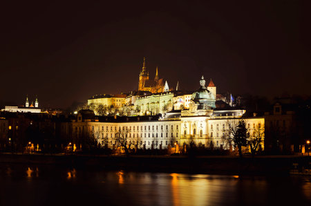 Prague, Czech Republic - March 20, 2017: View of the illuminated Prague Castle in the evening.