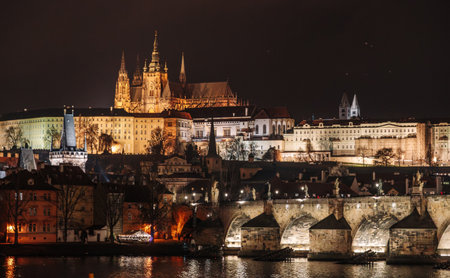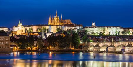 Prague, Czech Republic - October 7, 2017: Beautiful night panorama of Charles Bridge, Vltava river and Saint Vitus Cathedral, Prague, Czech Republic. Charles Bridge and Vltava river with night lights.