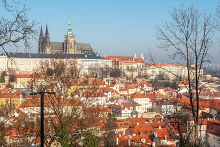 prague castle viewed from vysehrad castle complex is the highlight of panorama or prague which is also remarkable for typical red rooftops.