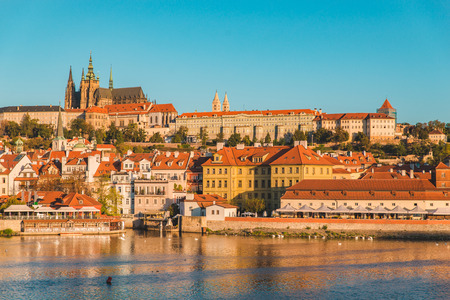 View on St. Vitus Cathedral and Prague Castle across Vltava river on a brigh Autumn day