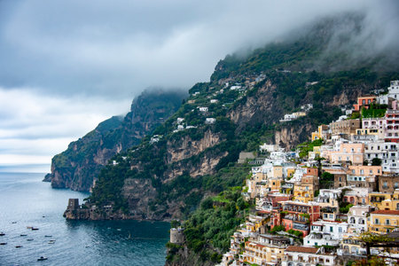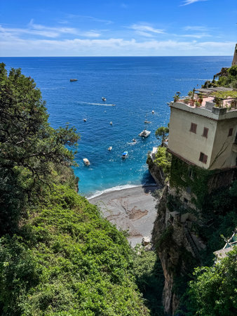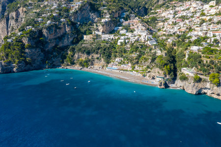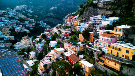 Positano, Italy - 04.26.2025: Positano is a beautiful town in southern Italy, on the Amalfi Coast; high angle view.