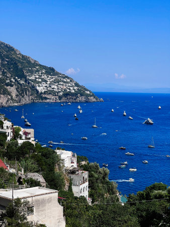 A stunning view of the Mediterranean coastline featuring a picturesque hillside village and numerous boats on the vibrant blue sea under a clear sky. Positano, Italy.