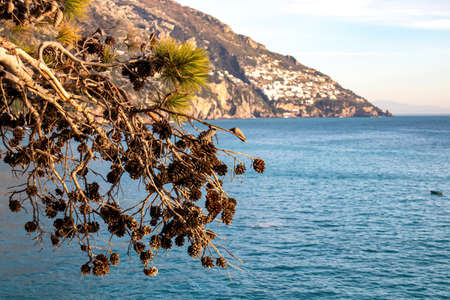 Path of the Gods with panoramic view from Positano on coastal town Praiano in distance, Amalfi Coast, Italy, Campania, Europe. Selective focus on branch of conifer cones, blurred Mediterranean Sea