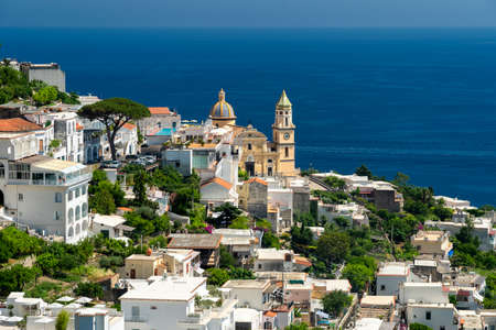 Panoramic view on church Chiesa Nuova and colorful houses of coastal town Positano, Amalfi Coast, Italy, Campania, Europe. Vacation at coastline at the Mediterranean Sea. Praiano in distance