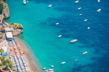 Empty beautiful beach on the Amalfi Coast, Campania, Italy, Europe. Summer holiday and vacation concept. Inspirational tropical paradise beach. Province of Salerno. Turquoise colored water. Hidden Gem