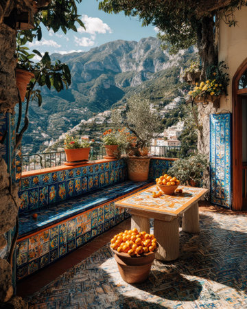 An outdoor terrace is filled with plants, citrus fruits, and rustic tiles with a breathtaking mountain backdrop. Warm sunlight bathes the scene, enhancing the natural colors of the plants. This idyllic setting could be used to illustrate tranquility, travel, and lifestyle concepts for diverse editorial and commercial projects.