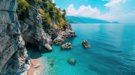 A drone soars above dramatic coastal cliffs, capturing their rugged beauty in stunning aerial photography Majestic views unfold, showcasing pristine nature and breathtaking landscapes The power of the ocean crashes against the rocky shores, a testament to the raw beauty of the coast AI Generative