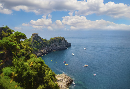 The view of stone tower on the Amalfi coast. This is on the south of Italy in Europe. The city stands on cliffs above the sea. There are boats on the sea. The sky is blue with white clouds in the background in sunny day at summer.