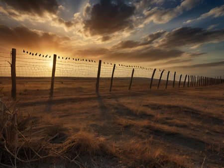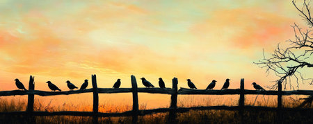 Flock of birds on a wooden fence in the Netherlands at sunset