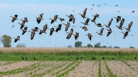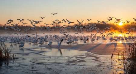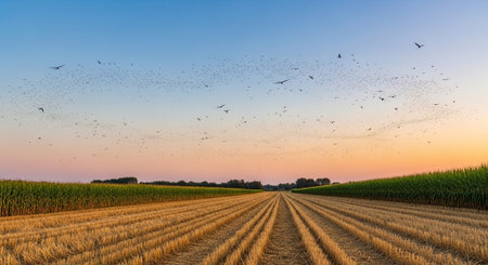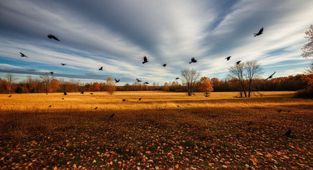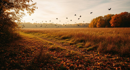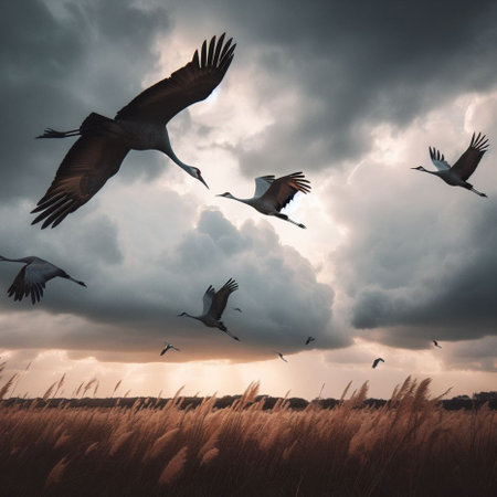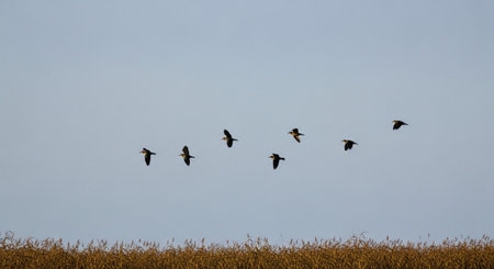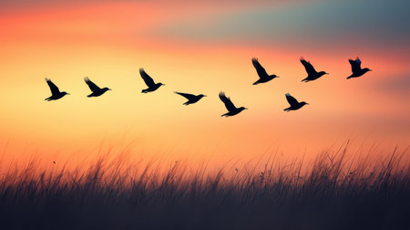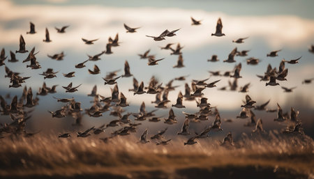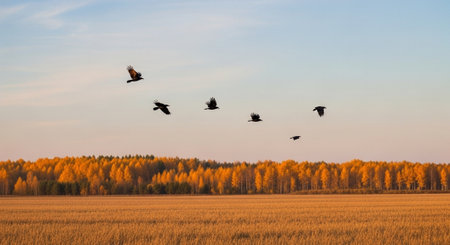 Migratory birds in flight, soaring over golden fields at dusk, their formation against a backdrop of fading light signaling the onset of seasonal change.
