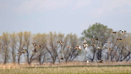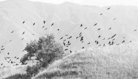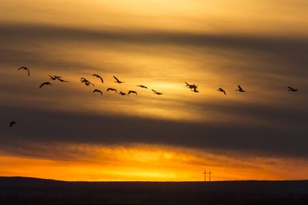 Flock of geese flying in the steppe. Birds flying in the steppe.