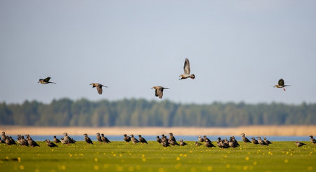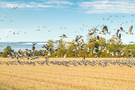 A big flock of barnacle gooses is sitting on a field and flying above it. Birds are preparing to migrate south.