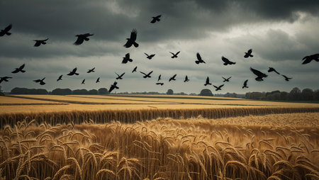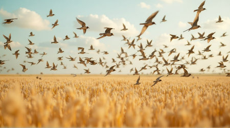Flock of birds soaring over golden wheat field under a bright blue sky, freedom concept