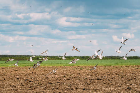Flock of birds flying on the beach, beautiful cloudy sky background, panoramic view