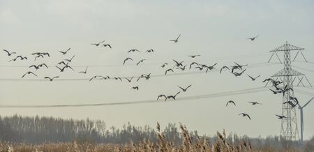 Flock of geese flying in a bright blue sky over wetland in sunlight in winter, Almere, Flevoland, The Netherlands, March 2, 2021