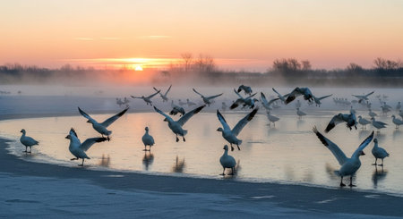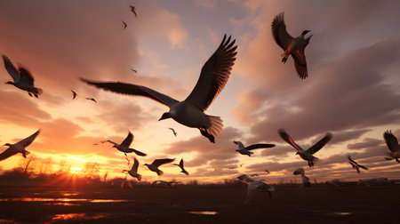 A flock of birds is silhouetted against a vibrant sunset. The composition showcases a fiery gradient of orange and red hues in the sky. The image has a painterly style with diffused lighting and an atmospheric perspective. Suitable for various editorial and commercial applications.