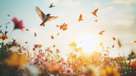 A stunning sunset scene captures birds soaring over a vibrant flower field, creating a serene and peaceful atmosphere in nature's beauty.