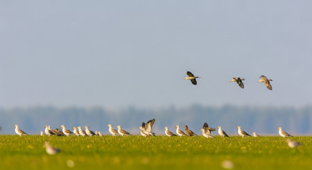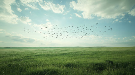 A peaceful landscape featuring a flock of birds soaring over a lush green field. The serene scene highlights the beauty of nature under a soft, cloudy sky.