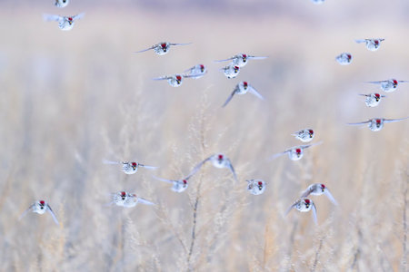 Very big flock of Common redpoll flies over dry grass field and forest in winter