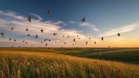 A stunning image of a flock of birds soaring through the golden hour skies, with vibrant sunlight casting a warm glow over lush fields and distant mountains.