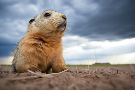 mid-chirp prairie dog with a dramatic stormy sky backdrop