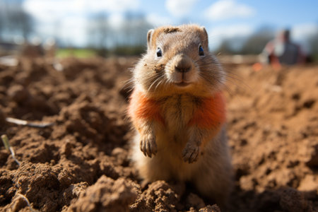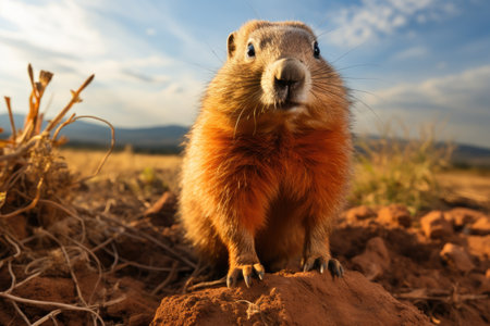 a ground squirrel stands in the sunset, captured in a rich and immersive style. this high-definition image showcases vray tracing techniques, reminiscent of the works of werner herzog and matthias haker. the squirrel's strong facial expression is highlighted against the backdrop of beige and azure tones. ai generated