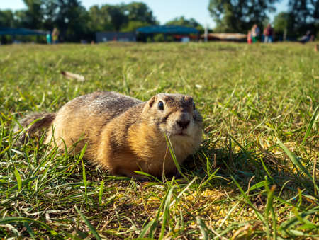 Funny gopher in the park on Tatyshev Island in Krasnoyarsk