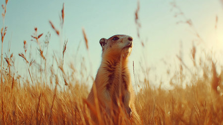 A charming gopher looks up in surprise amid lush green grass, bathed in the warm glow of sunset.. AI Generation