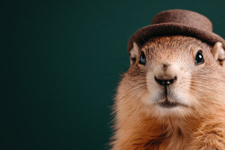 Adorable groundhog wearing a small brown hat looking forward with a curious expression.
