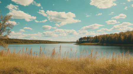 A serene lakeside scene featuring calm waters reflecting a bright blue sky adorned with fluffy clouds, surrounded by lush greenery and golden grass.