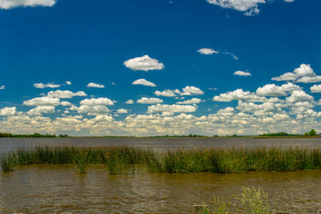 summer photography, a river overgrown with reeds, blue sky with white clouds, blue water covered with duckweed, river floodplain, sultry summer day