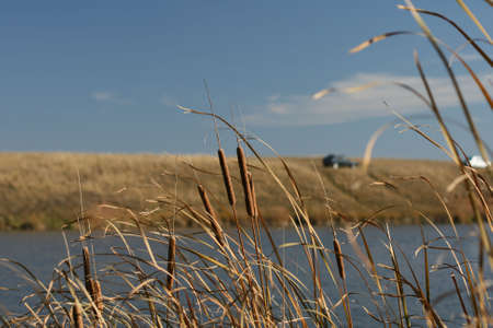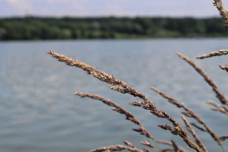 Detail of dry grass on the lake shore. Focus on ear of grass.