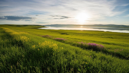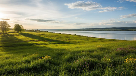 Sunset over the lake in summer. Landscape with green grass and flowers.