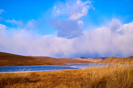 Dry grassland and lake under cloudy blue sky, Khakassia, Siberia, Russia