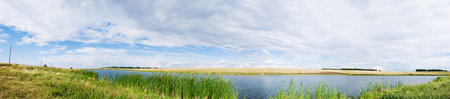 Bright summer panoramic landscape with beautiful lake and green hills during sunny day.summer landscape with field, lake and trees, reflection and cloudy sky.