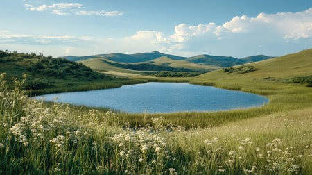 A beautiful landscape featuring a tranquil lake surrounded by vibrant green hills and a clear blue sky with soft clouds, perfect for nature lovers and serene escapes.