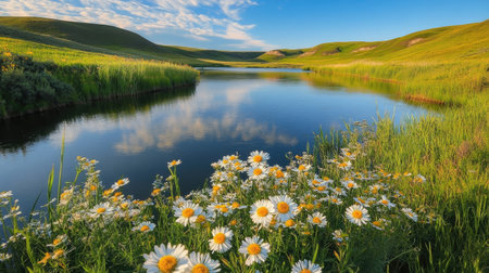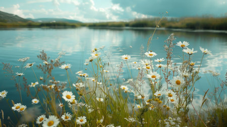 A beautiful lake scene featuring vibrant daisies and lush greenery under a bright blue sky. Perfect for showcasing nature's tranquility and charm.