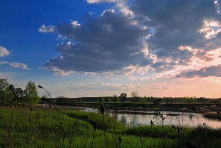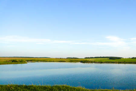 Summer landscape with lake in the field with blue sky. Sunset orange sun on the horizon.