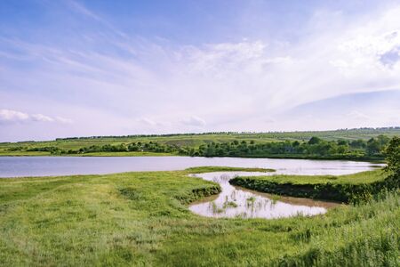 Nature landscape of a green field by the blue river concept. Summer season background. Travel in countryside. Blue sky with white clouds.