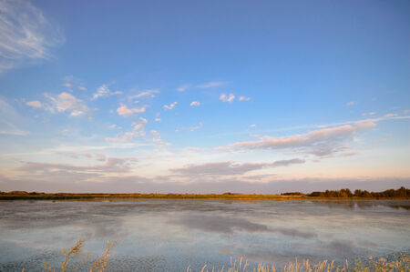 Sunset over the lake with clouds reflected in the water. Landscape.