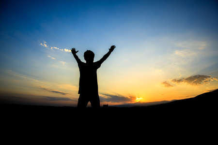 Silhouette of a man standing and rise his hands up in the air during sunset